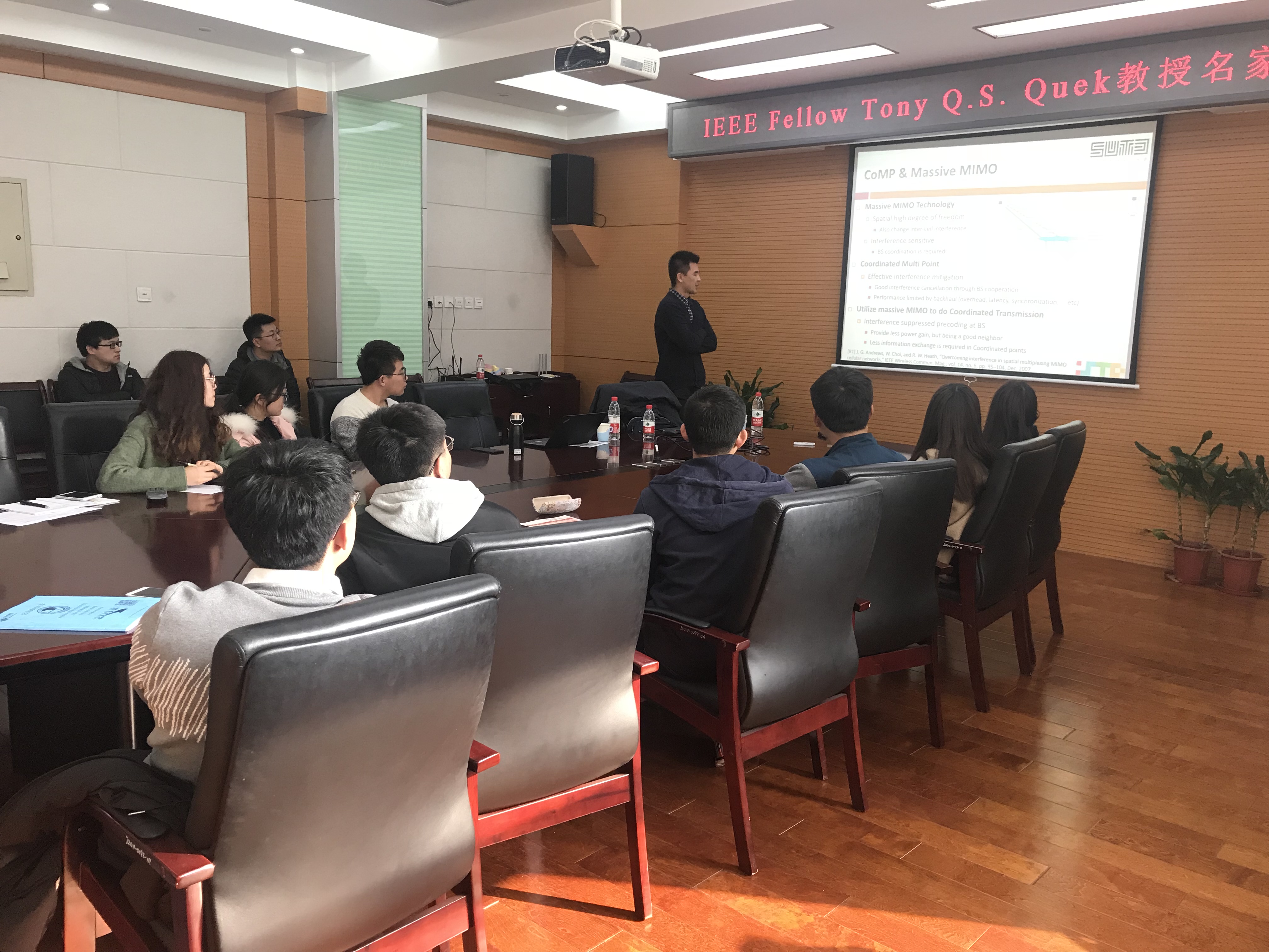 在报告会上,Tony教授分别分享了他团队在新加坡科技与设计大学进行的最新研究成果和他个人的求学、治学、从事科研和教职的经验和心得。在Massive MIMO技术方面,重点探讨了他团队在mMTC和uRLLC等物联网场景下,现在和未来的研究热点、技术挑战和机会。重点探讨了基于small cell场景下的资源调度和分配技术,针对uRLLC实时场景下的跨层网络优化方案以及接入控制技术等。随后,他还详细分享了他在日本和MIT的求学中遇见的各种问题以及解决思路和办法,最后他分享了在新加坡科技设计大学从事科研和教学中有关团队甄选、科研方向的选择、学生的指导、项目的策划等方面的宝贵经验。