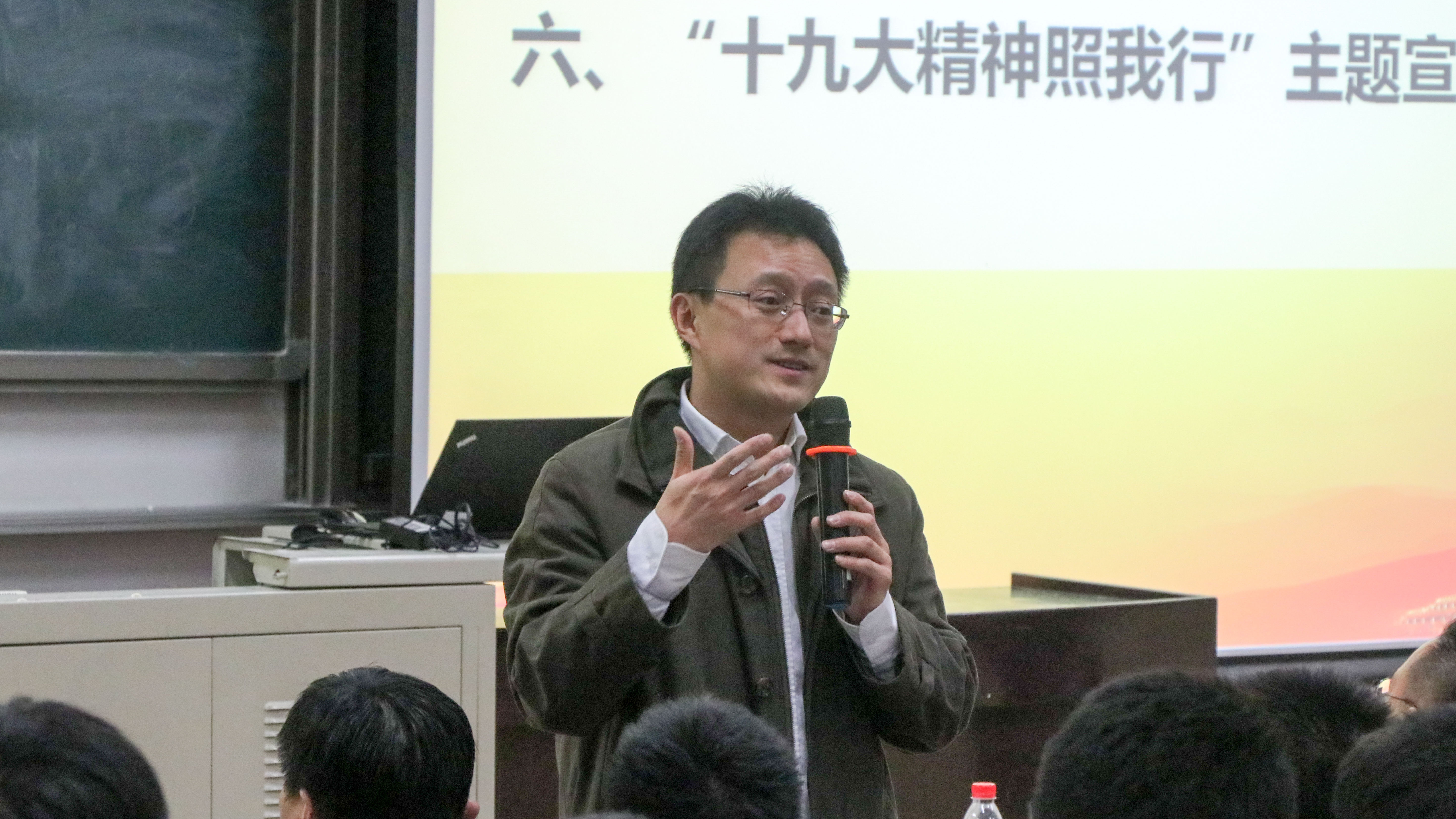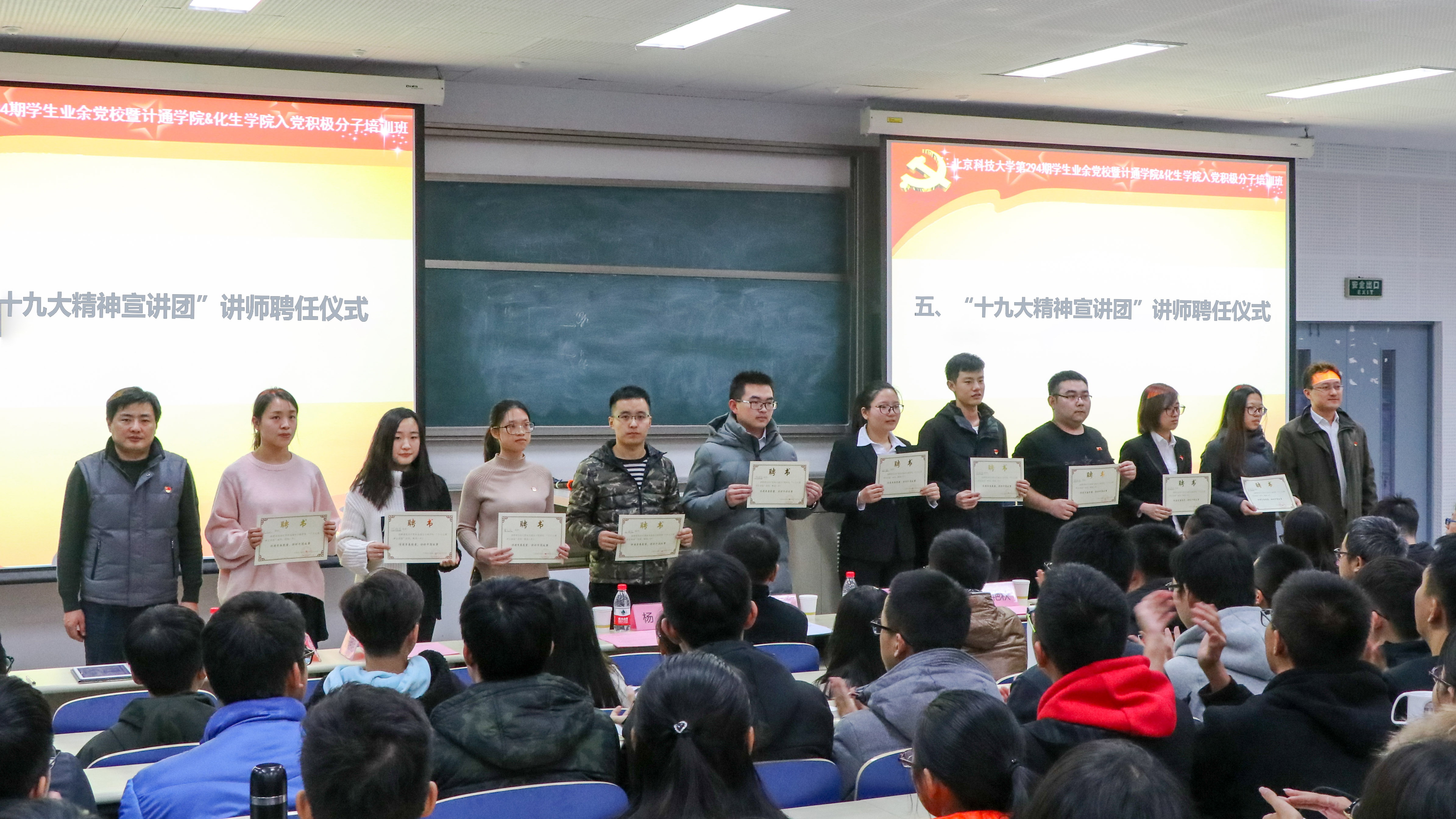 十九大的胜利召开,在新的历史起点上开启了党和国家事业新征程,学习宣传贯彻党的十九大精神是当前和今后一个时期我们的首要政治任务。为了帮助同学们更好地学习十九大精神,计通学院与化生学院成立了“十九大精神”宣讲团,聘请了理论水平高、表达能力强的教师和同学担任讲师,并借此次机会进行了聘任仪式,由黄武南、郑安阳两位老师上台为十九大精神宣讲团讲师颁发聘书。随后,讲师代表姚航为大家带来了一场宣讲展示。
