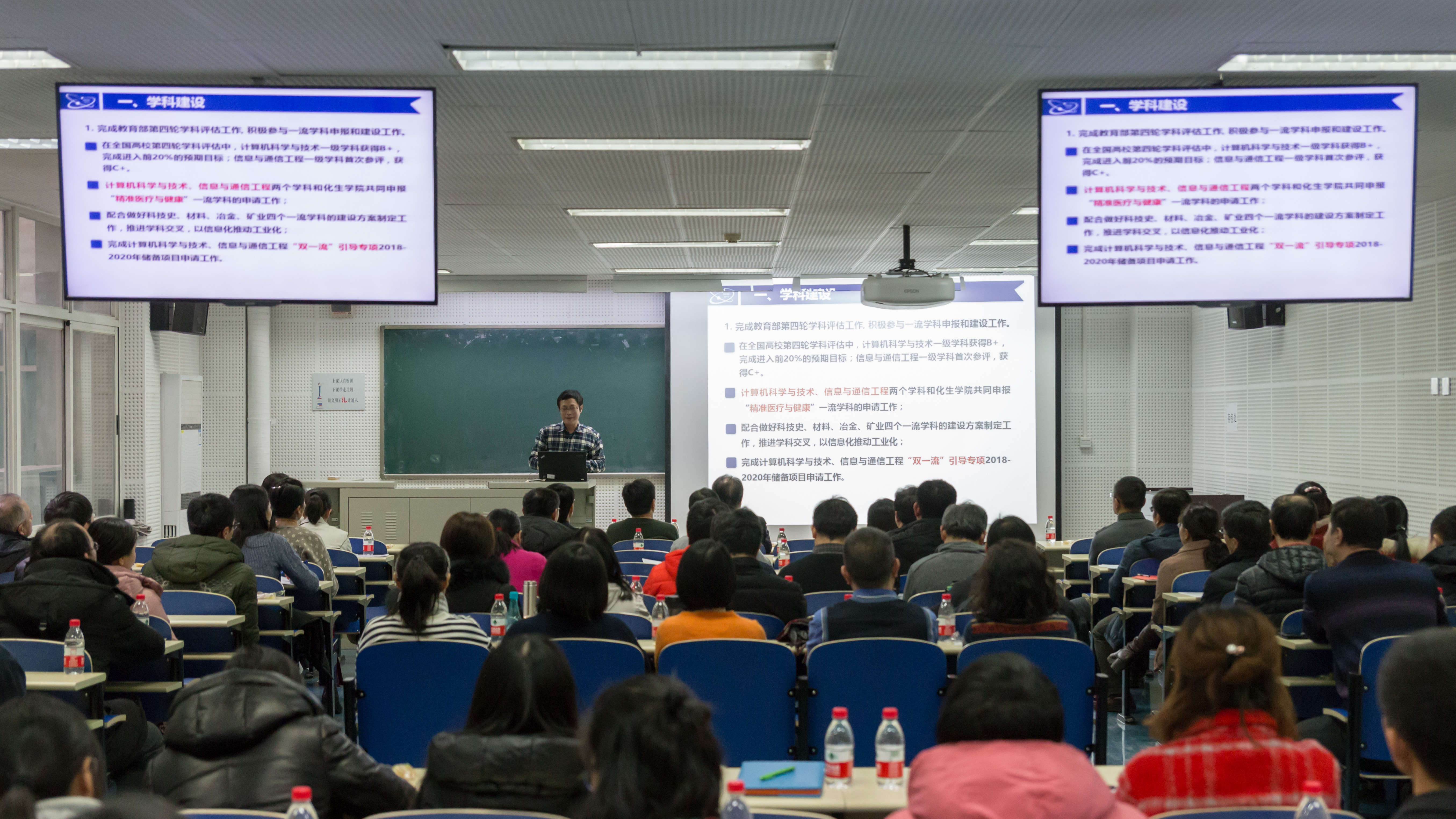 院长隆克平作年度工作报告。隆院长从学科建设、教育教学、科研工作、师资队伍、国际交流、党建学生、安全稳定、工作计划等方面,对2017年学院整体工作进行了总结回顾,对过去一年里全体教职工爱岗敬业、锐意进取的精神予以充分肯定,对大家在学科评估、党建评估、安全稳定等关键节点所表现出来的大局意识、忘我精神表示感谢。隆院长强调:2018年全院上下要学习认真学习、宣传、贯彻落实十九大精神,积极谋划推进学科建设,以人才培养为中心加强专业建设,认真做好本科教学评估工作以及工程认证申请和进校评估工作。