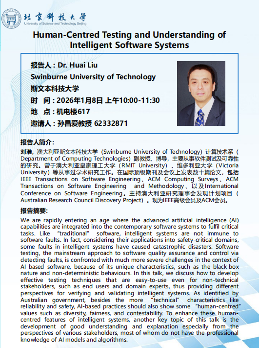 讲座内容:探讨智能系统面临的软件安全风险及测试挑战,分析其黑盒特性与非确定性行为带来的难题。分享面向用户的有效测试技术,解释如何建立以人为本的价值体系(如多样性与公平性)。介绍针对不同背景的研究人员如何提升对智能系统的理解。