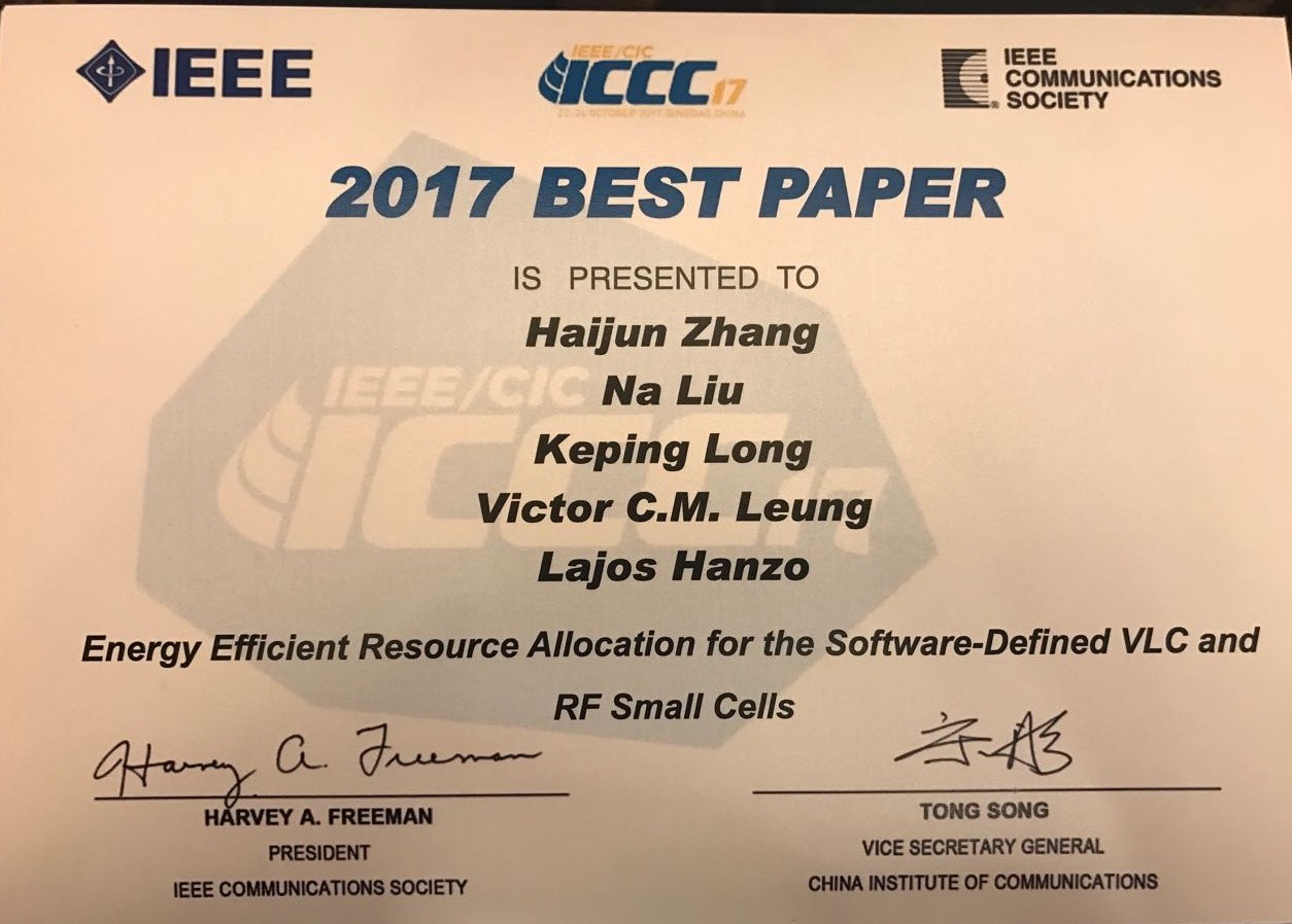 近日,第六届中国国际通信大会(IEEE/CIC International Conference on Communications in China, ICCC 2017)在山东青岛召开。以我院隆克平教授为通信作者、张海君教授为第一作者的参会文章获得最佳论文奖。 &...